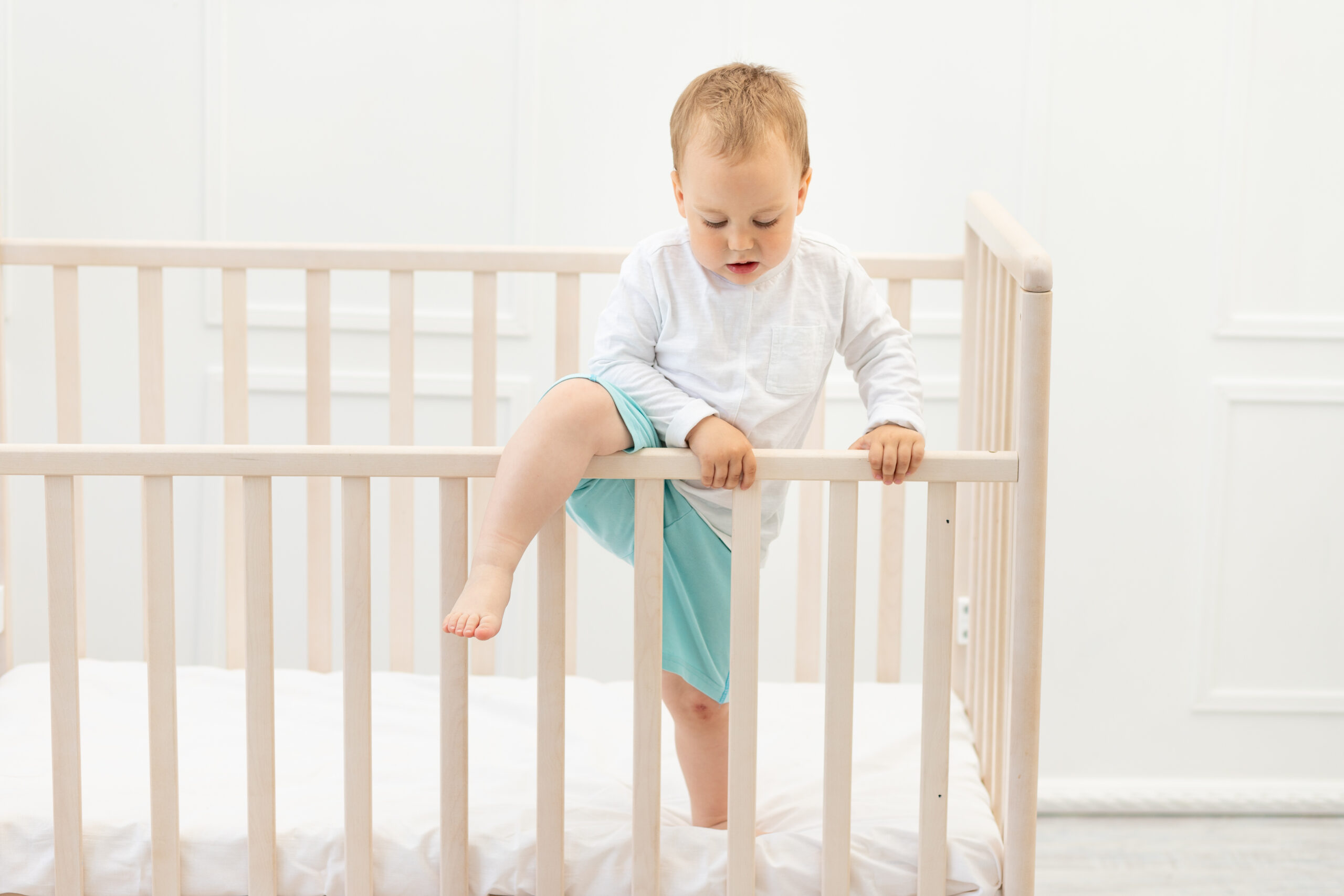 baby climbs out of the crib, baby boy 2 years old in the crib